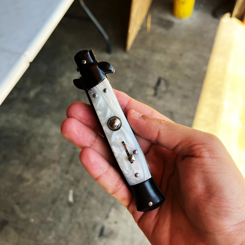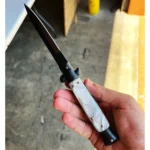 9″ Italian Milano Stiletto Switch blade Automatic Knife, White Marble Resin Handle with Nylon Pouch