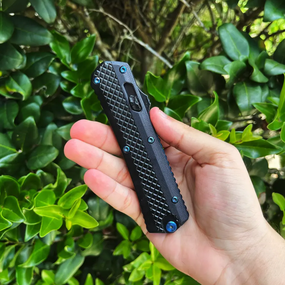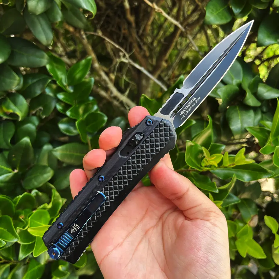 DELTA FORCE USA OTF AUTOMATIC KNIFE. 5.5″ CLOSED, BLACK/SATIN TWO TONE DAGGER BLADE RED RIVETS AND CLIP, ZINC ALLOY HANDLE WITH G10 INSERTS INCLUDES NYLON POUCH