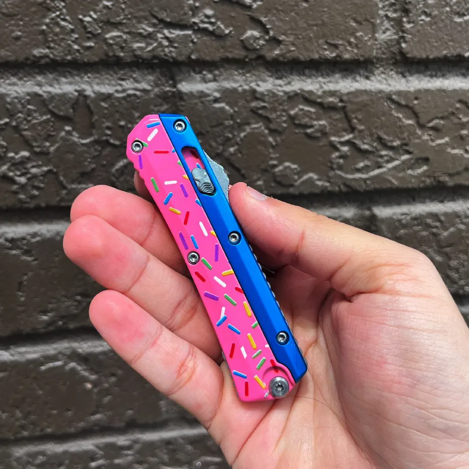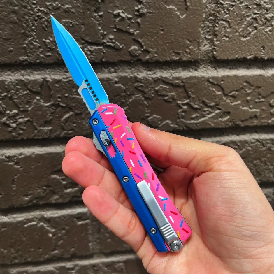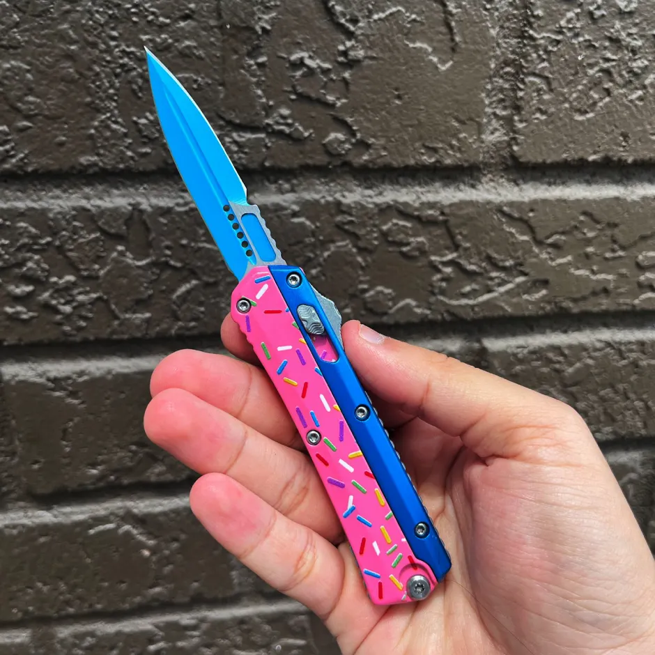 DELTA FORCE USA 7″OVERALL OTF KNIFE BLUE AND PINK SPRINKLES COLOR COMES WITH SHEATH
