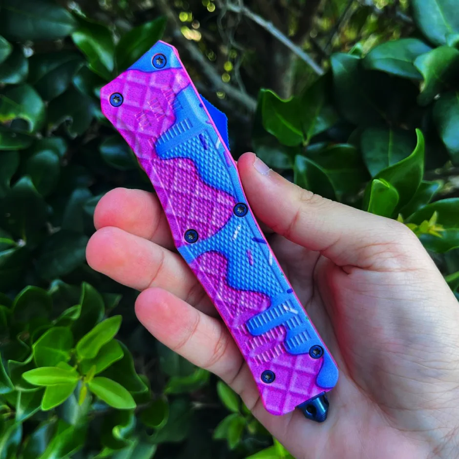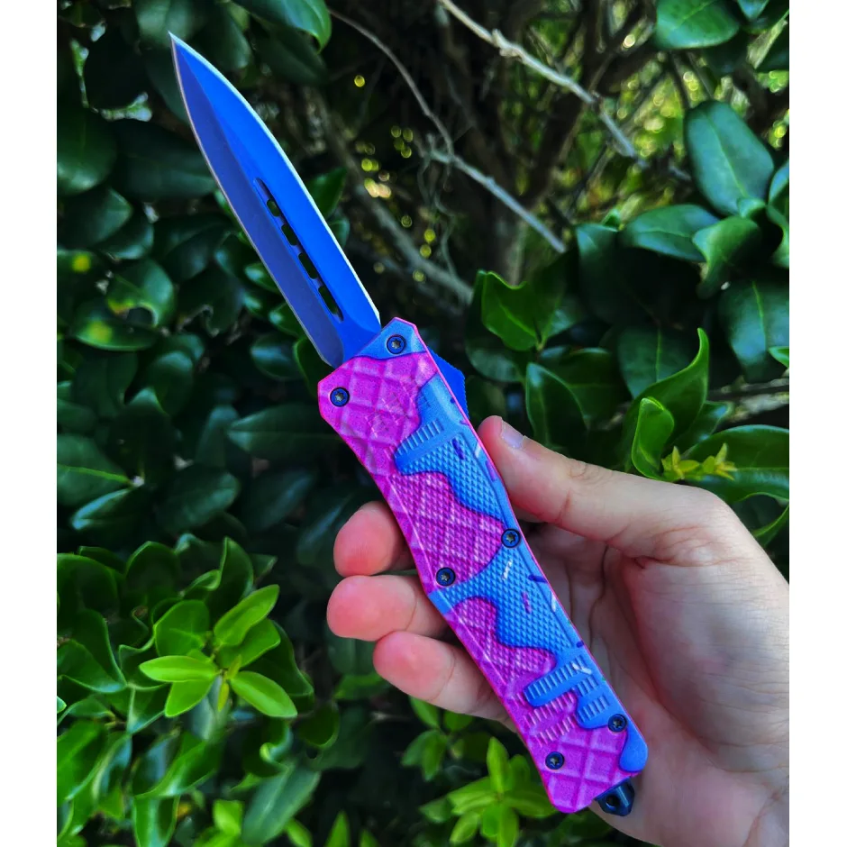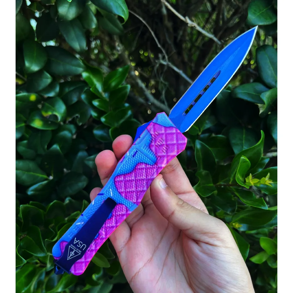 OTF AUTOMATIC KNIFE 4.15″ CLOSED, 8″ OVERALL, BLUE TITANIUM COATED STAINLESS STEEL BLADE, 3D WAFFLES ZINC ALLOY HANDLE WITH CLIP INCLUDES NYLON SHEATH