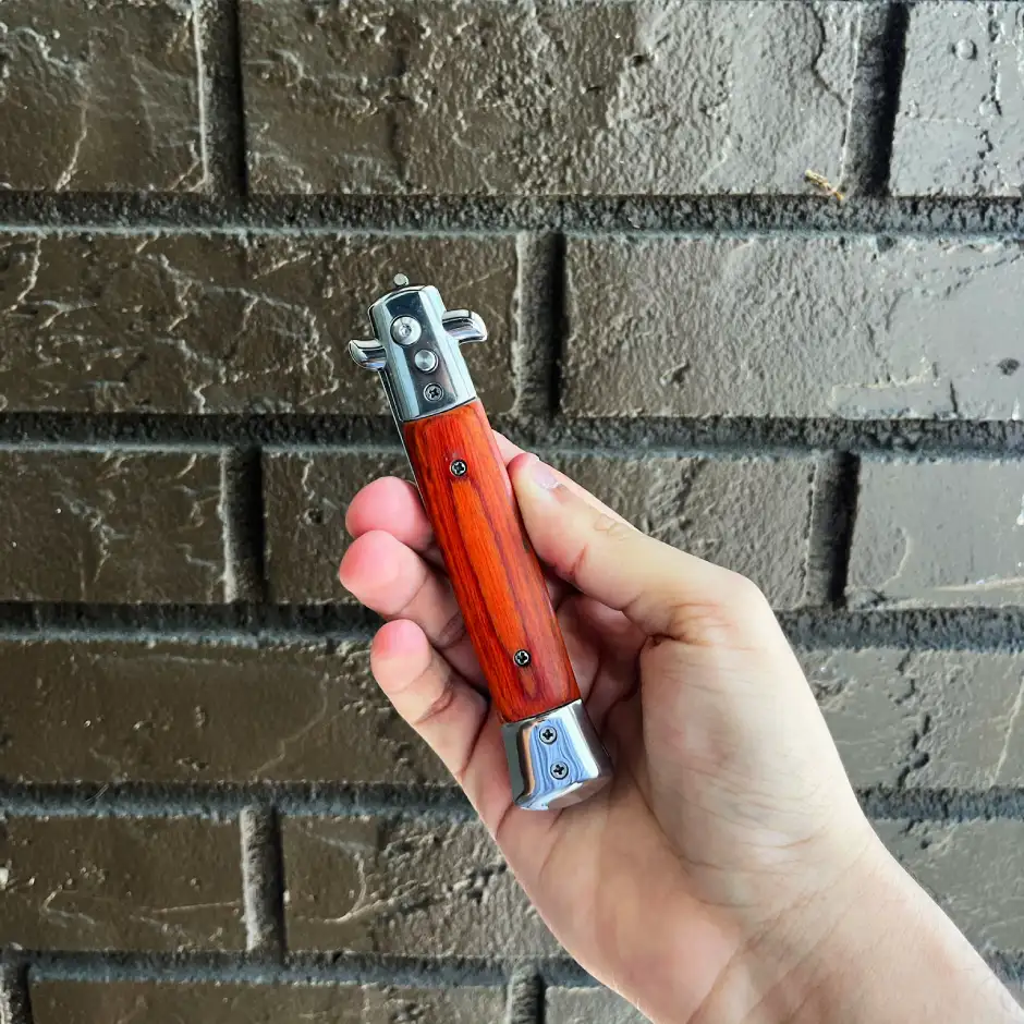 5″ CLOSED, 9″ OVERALL, AUTOMATIC KNIFE WITH SAFETY LOCK 4″ STAINLESS STEEL BLADE WOOD OVERLAYS S.S HANDLE WITH CLIP